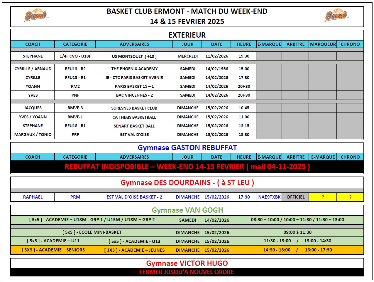 - Planning des matchs du prochain week-end.